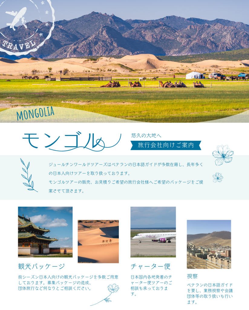 ジュルチン・ワールド・ツアーズは、あらゆるタイプの旅行者にオーダーメイドの旅を提供します。初めて冒険をされる方でも、ベテランの個人旅行者でも、最も素晴らしい場所、人々、文化を発見するお手伝いをいたします。旅のスペシャリストである私たちのチームは、お客様が私たちに旅行を予約する前と後の両方で、プロフェッショナルで洞察力のあるサービスを提供します。お客様のお好みに合わせて、何百もの旅程からお選びいただけます。モンゴル国内外での大規模な会議の手配をお考えの大企業の方、または専門性の高いニーズをお持ちの個人の方。モンゴル国内外での大規模な会議の手配をお考えの大規模な組織の方、専門性の高いニーズをお持ちの方など、弊社にお任せください。私たちは、お客様のご予約ができるだけ簡単であるように努めています。世界中に4つの代表支店があり、迅速なオンライン・アシスタンスが可能です。